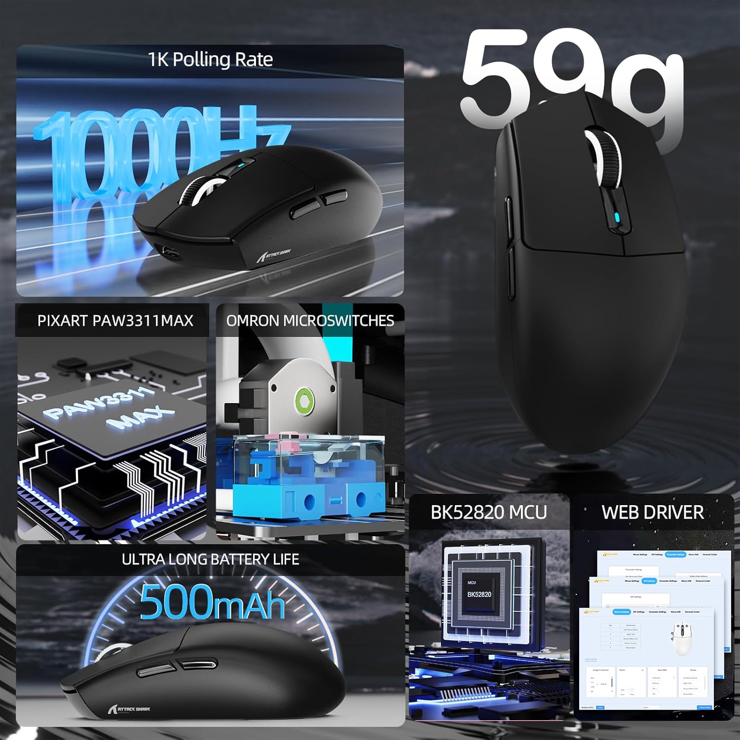 - 【Pro-Grade Precision & Speed】 ATTACK SHARK G3 PRO wireless mouse dominate with the PixArt PAW3311 gaming sensor and Broadcom BK52820 custom MCU, delivering zero latency and pixel-perfect tracking. This mouse allows you to fine adjust the DPI from 100 to 25000, the polling rate up to 1000Hz,tracking speed 300IPS,acceleration 40G.Experience unmatched responsiveness for FPS headshots and MOBA skill combos, capturing every flick and micro-movement flawlessly.