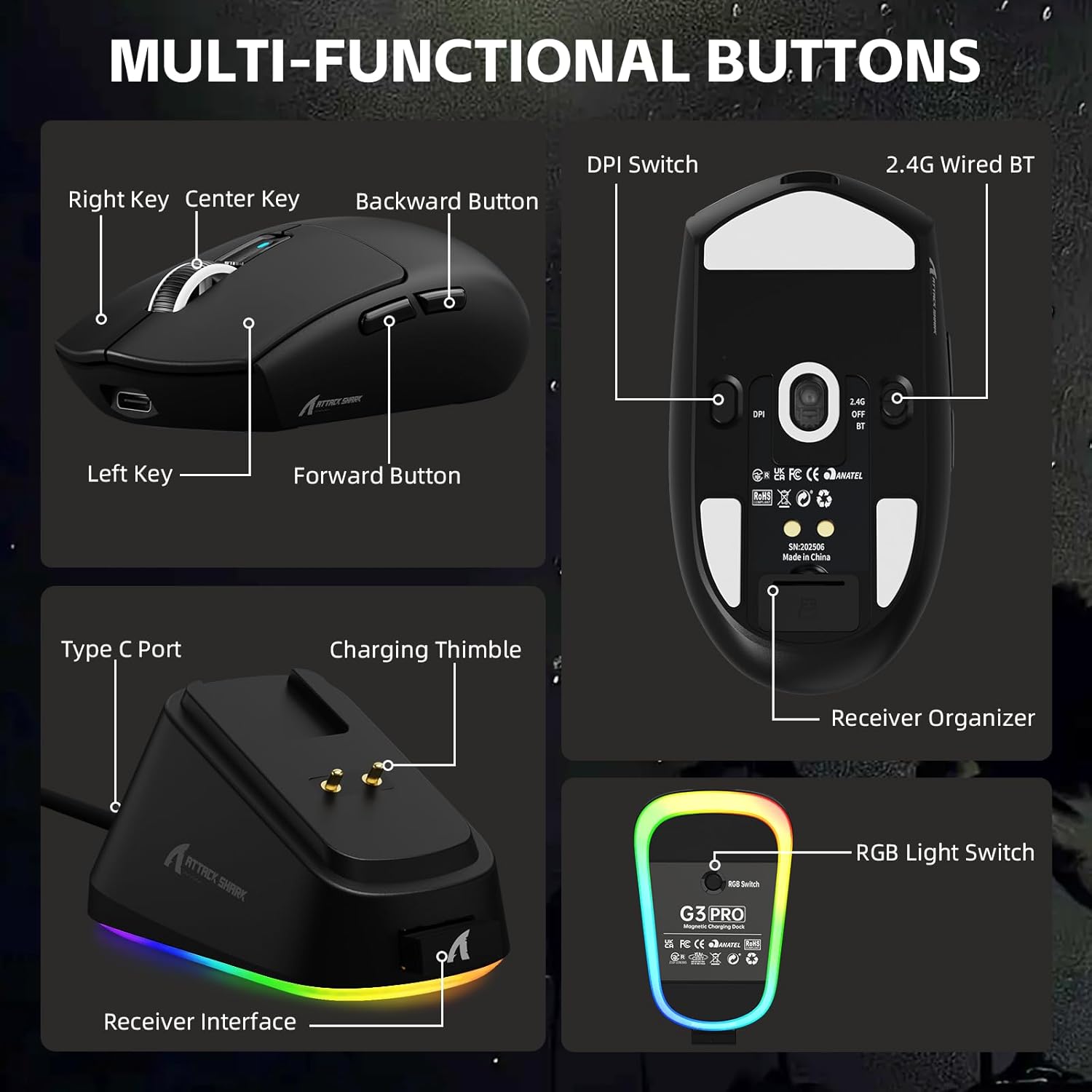 ATTACK SHARK G3PRO Wireless Gaming Mouse with RGB Charging Dock,2.4G/USB-C Wired/BT PAW3311 Optical Sensor 1K Polling Rate Adjustable 25K DPI,500mAh Battery Ultra Lightweight 59g Mice(Black)
