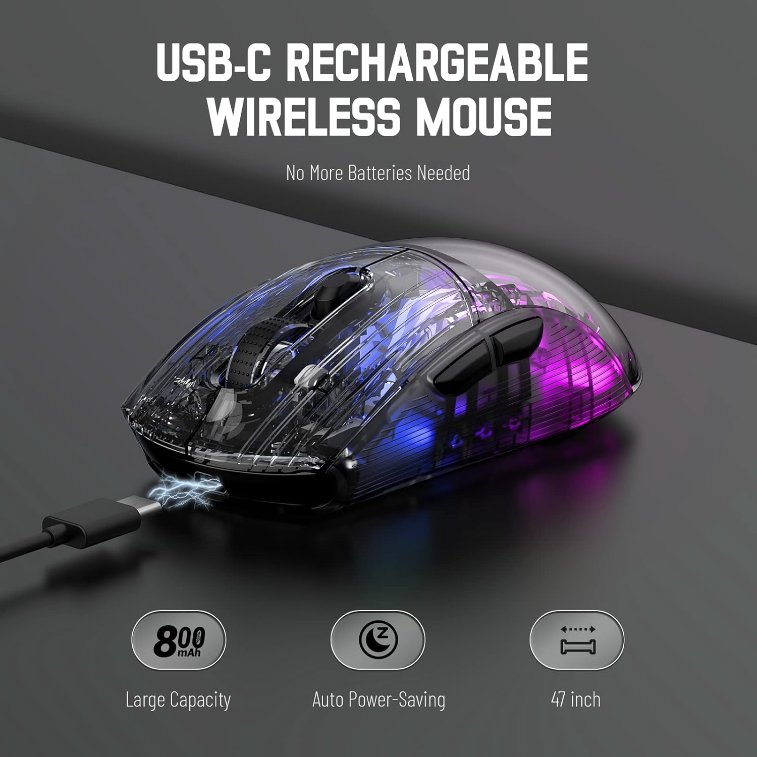 - Rechargeable & Smart Auto-sleep Rechargeable with USB A to Type C cable, which makes charging easier, faster and more stable. Smart Sleep protects the battery and extends usage time. The mouse will go into sleep mode after 2 minutes to conserve power and can be woken up by clicking any button or moving the mouse..