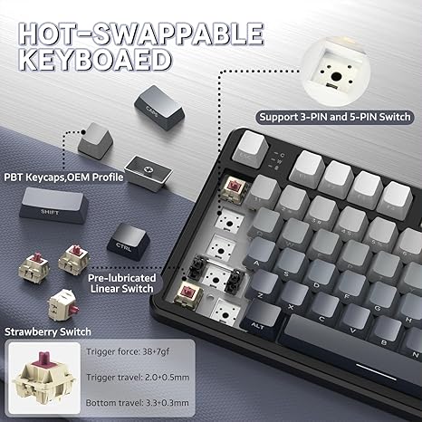 - 【Hot Swappable & Pre-lubed Strawberry Switches】This custom mechanical keyboard with hot-swappable base supports 3-pin or 5-pin switches replacement, full-keys anti-ghosting each keystroke is registered with accuracy and stability. Paired with pre-lubed strawberry switches, bring smooth typing feeling and pleasant typing sound, provide fast response for exciting game.