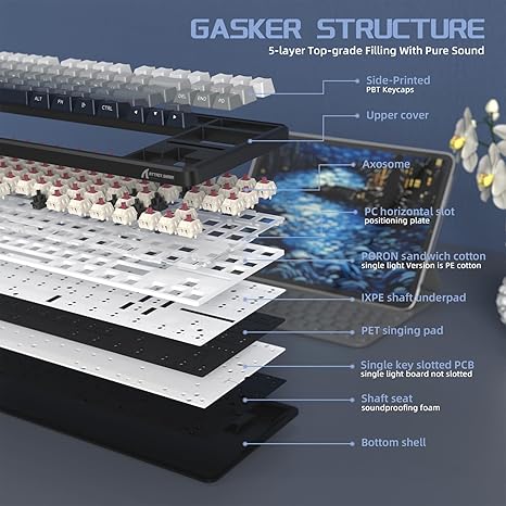- 【87Keys Gasket Mount Mechanical Keyboard】ATTACK SHARK X87 keyboard adopts Tenkeyless ultra-portable compact layout saving space for your desk still offering all the keys you need for gaming and work. Keyboard adopts a gasket structure with five layers of sound-absorbing material. There is PORON for buffering between the keyboard PCB board and the casing, which can effectively reduce the noise and vibrate of the keys, optimize the sound of the switches, and provide better office or gaming experience.