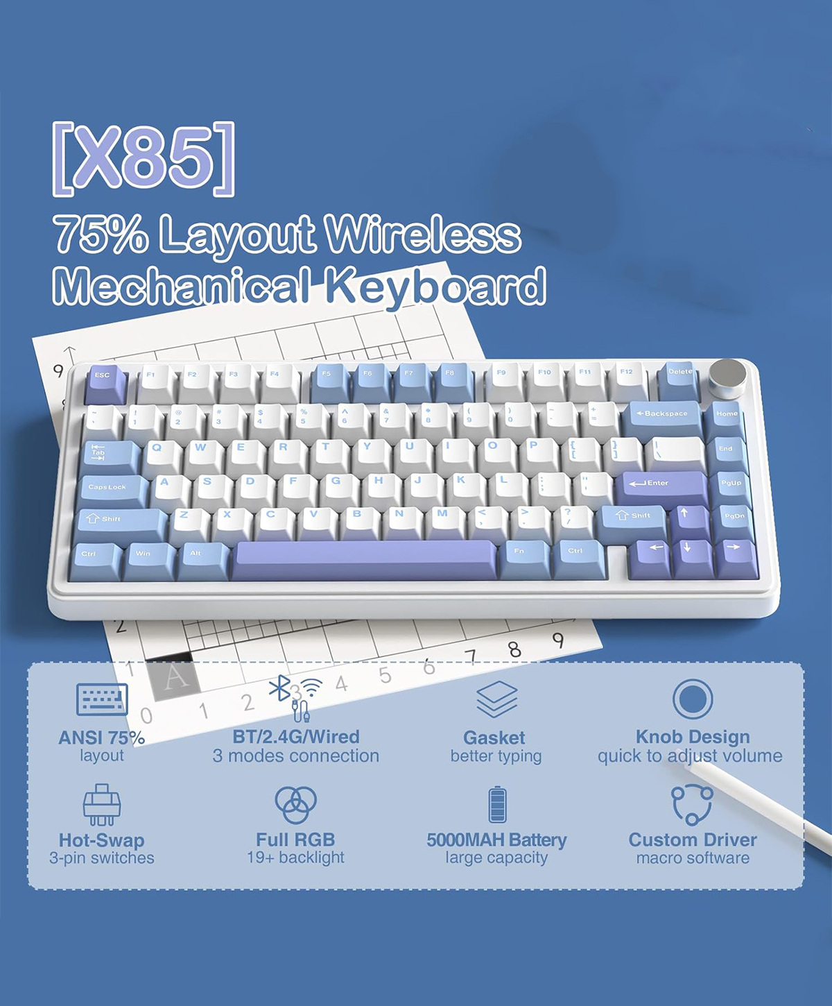 75% Gasket-mounted Bluetooth 5.1/2.4G Wireless & Type-C Wired Mechanical Keyboard