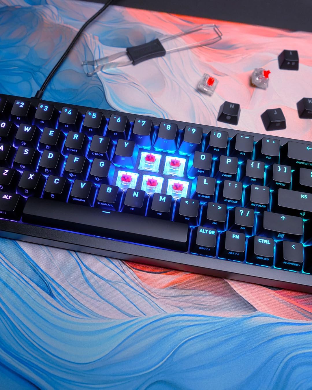 • Included in delivery: K5V2 mini keyboard, removable USB-C to USB-A cable (2 m long), removal tool for key caps and switches, 2x MX2A RED replacement switches, instruction manual