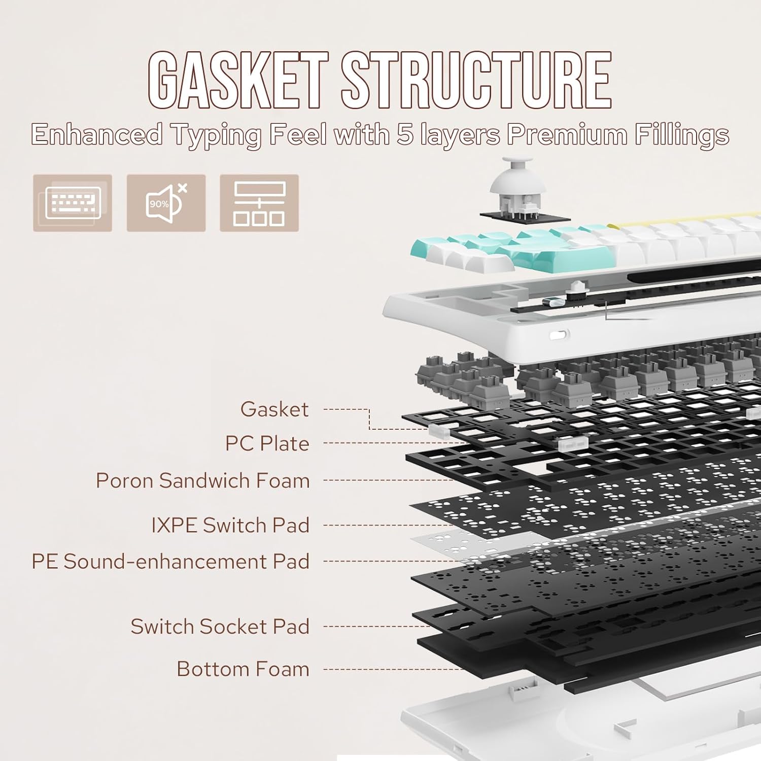 • Enhanced Typing Feel with Premium Fillings To elevate your typing experience, the RT65 incorporates five layers of sound and feel-enhancing materials, including Poron sandwich foam, IXPE switch pads, socket foam, PET film, and case foam. Combined with the gasket mount, these layers dampen vibrations, soften keystrokes, and minimize noise, creating a deeply satisfying and smooth typing experience. Finely tuned plate-mounted stabilizers further reduce unwanted rattling, ensuring every key press is consistent and enjoyable.