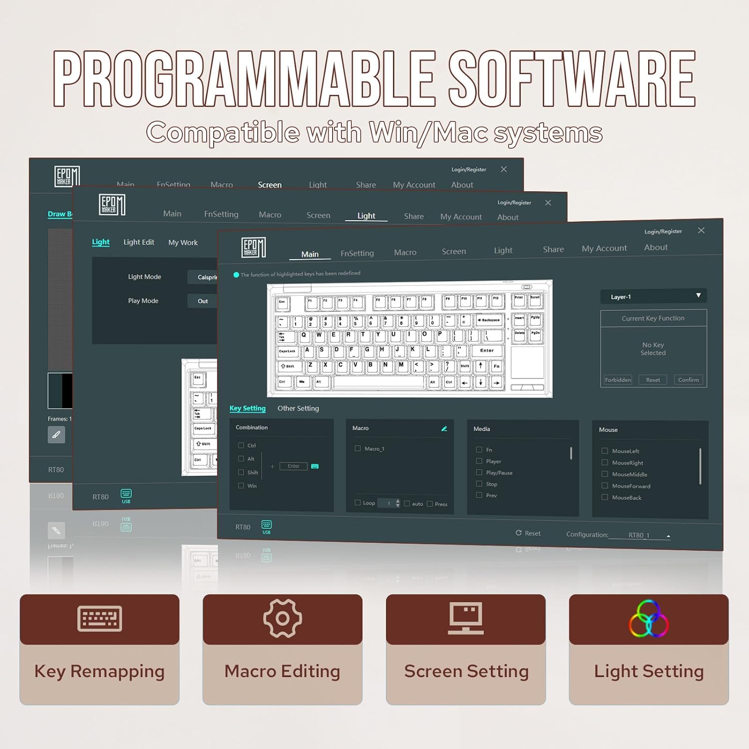 • NKRO & South-Facing LED for Enhanced Performance With N-key rollover (NKRO), the RT65 accurately registers multiple simultaneous key presses, essential for executing complex commands or engaging in fast-paced gaming. The keyboard’s south-facing RGB LEDs are designed to enhance visibility from the operator’s perspective, with 16 default lighting patterns and endless customization options available through the EPOMAKER driver.