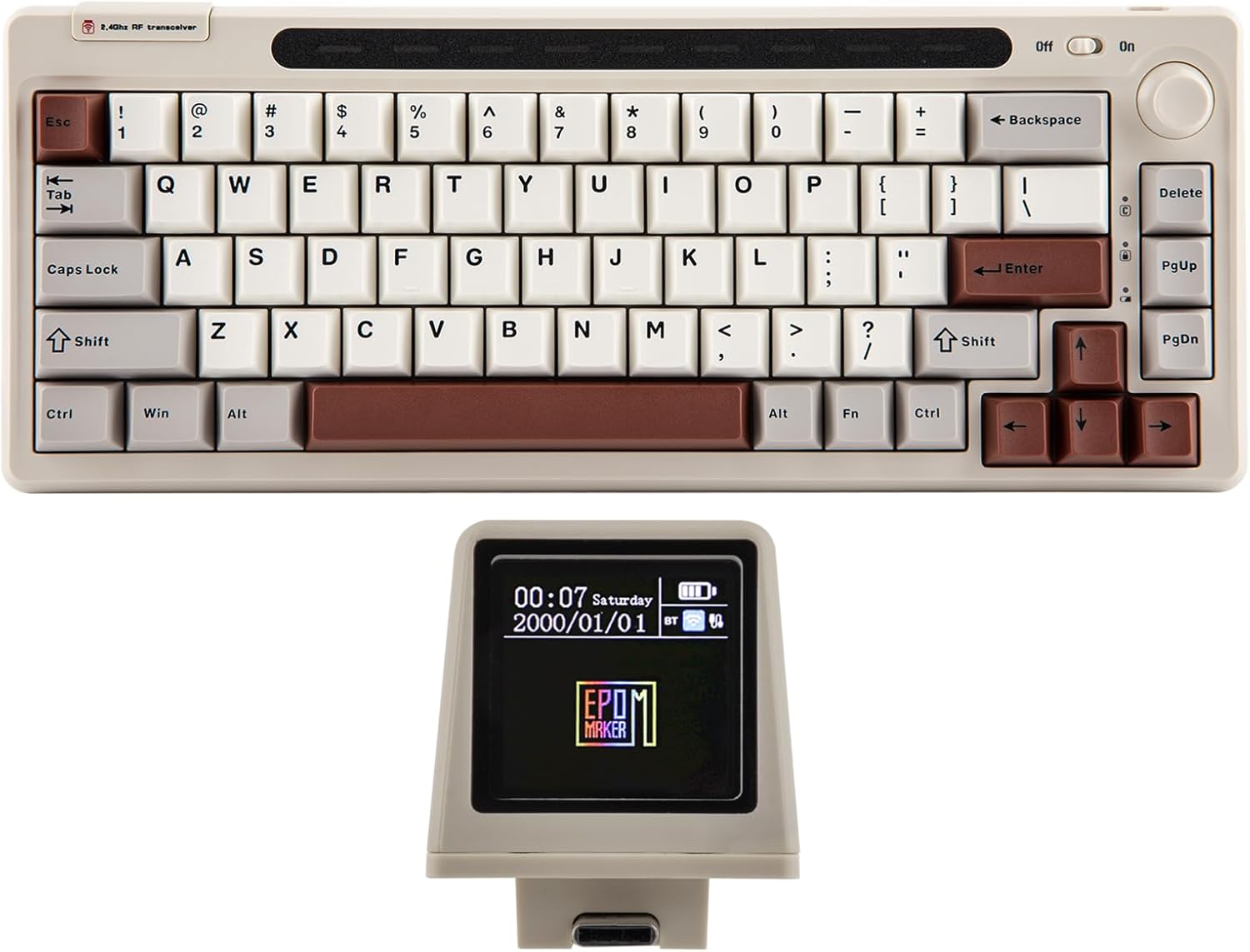 • Detachable Mini Display Following in the footsteps of the successful RT100, the EPOMAKER RT65 introduces new levels of customization and functionality to your typing experience. This keyboard comes with a detachable mini display, perfect for showcasing useful data such as the date, time, battery status and even your favorite anime GIFs. The mini display can be removed, revealing a hidden port for the 2.4GHz wireless receiver.