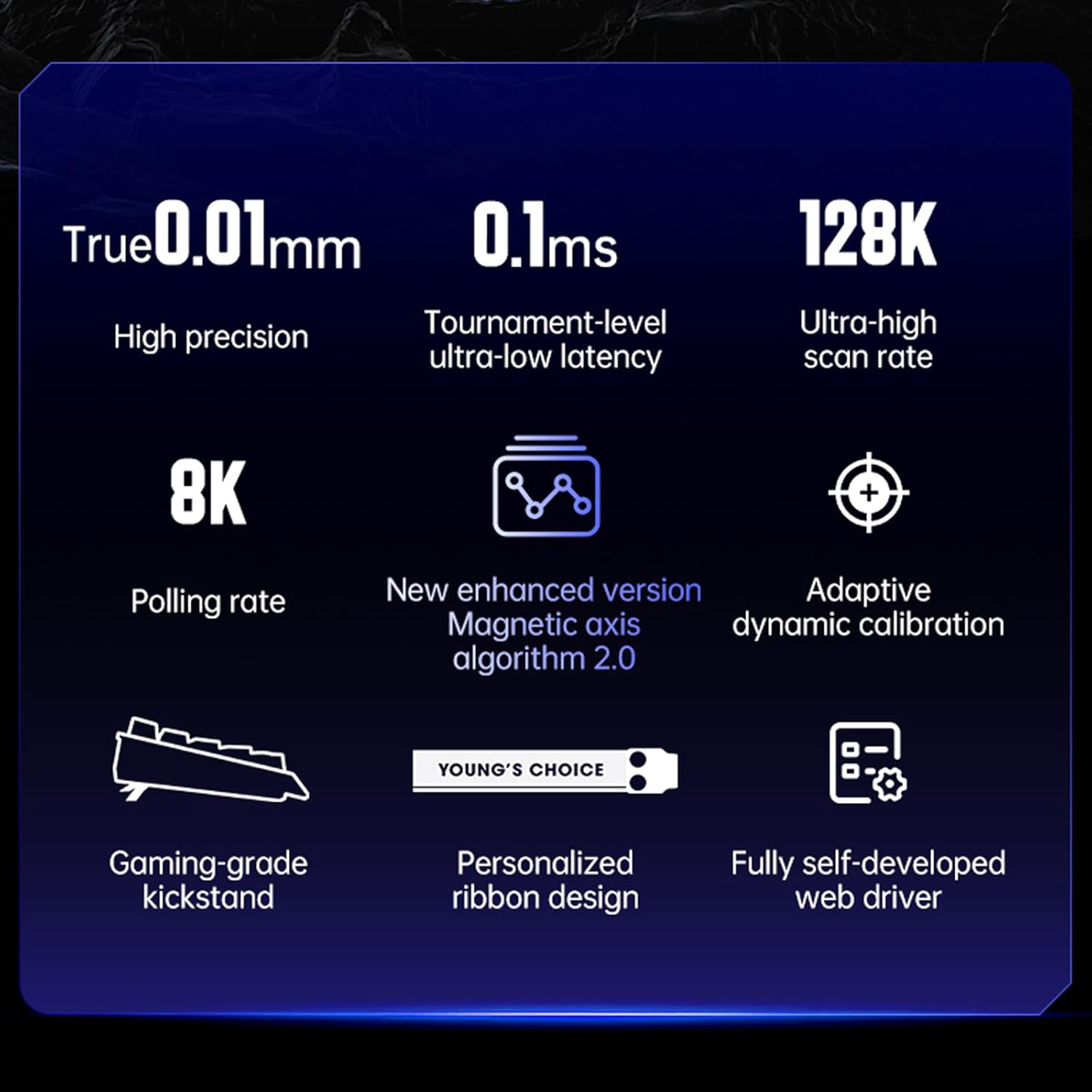 • 【Hall Effect Magnetic Switches】: The entire keyboard is equipped with fully adjustable high performance magnetic switches, enabling you to set every key’s actuation point from a light 0.01mm to a strong 3.4mm in 0.01mm steps, putting you in control for fast keypresses or ultra-accurate typing.