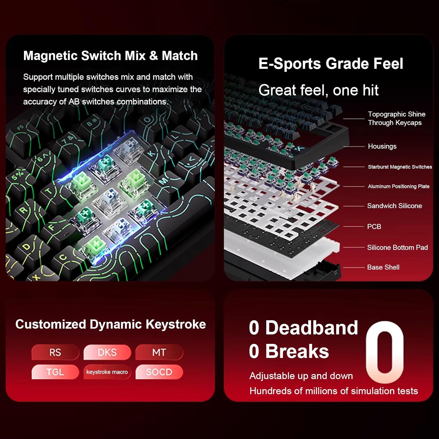 - 【RS, SOCD, DKS, MT, TGL, Keystroke Macros】for two actions for one keypress, Dual-point actuation lets you assign two discrete actions to one keypress, giving you the ability to execute instant one-two combos